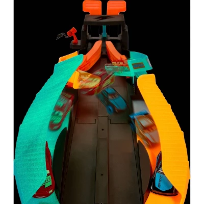 - Multiple set pieces and 2 Glow Racers vehicles glow in the dark!