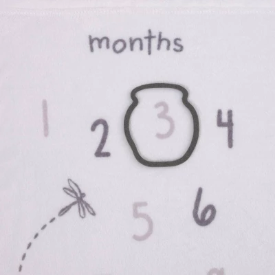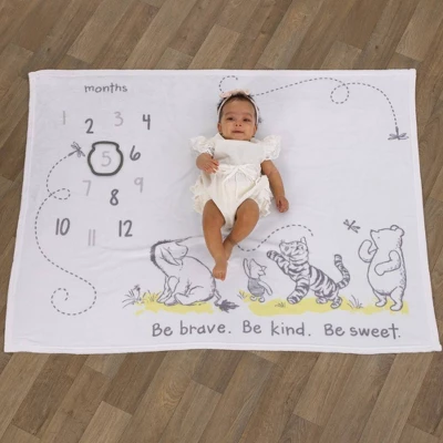 - The Classic Winnie the Pooh Milestone Baby Blanket features Winnie the Pooh, Tigger, Eeyore and Piglet