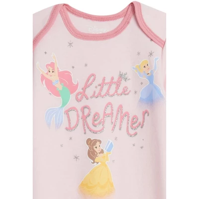 - Artwork featuring Princess Cinderella, Ariel The Little Mermaid, and Princess Belle; Blue gown features screen print of Cinderella with the text “born to sparkle” in silver glitter; Pink gown features screen print of Cinderella, Ariel The Little Mermaid, and Princess Belle with the text “little dreamers; White gown features all-over print of all three princesses